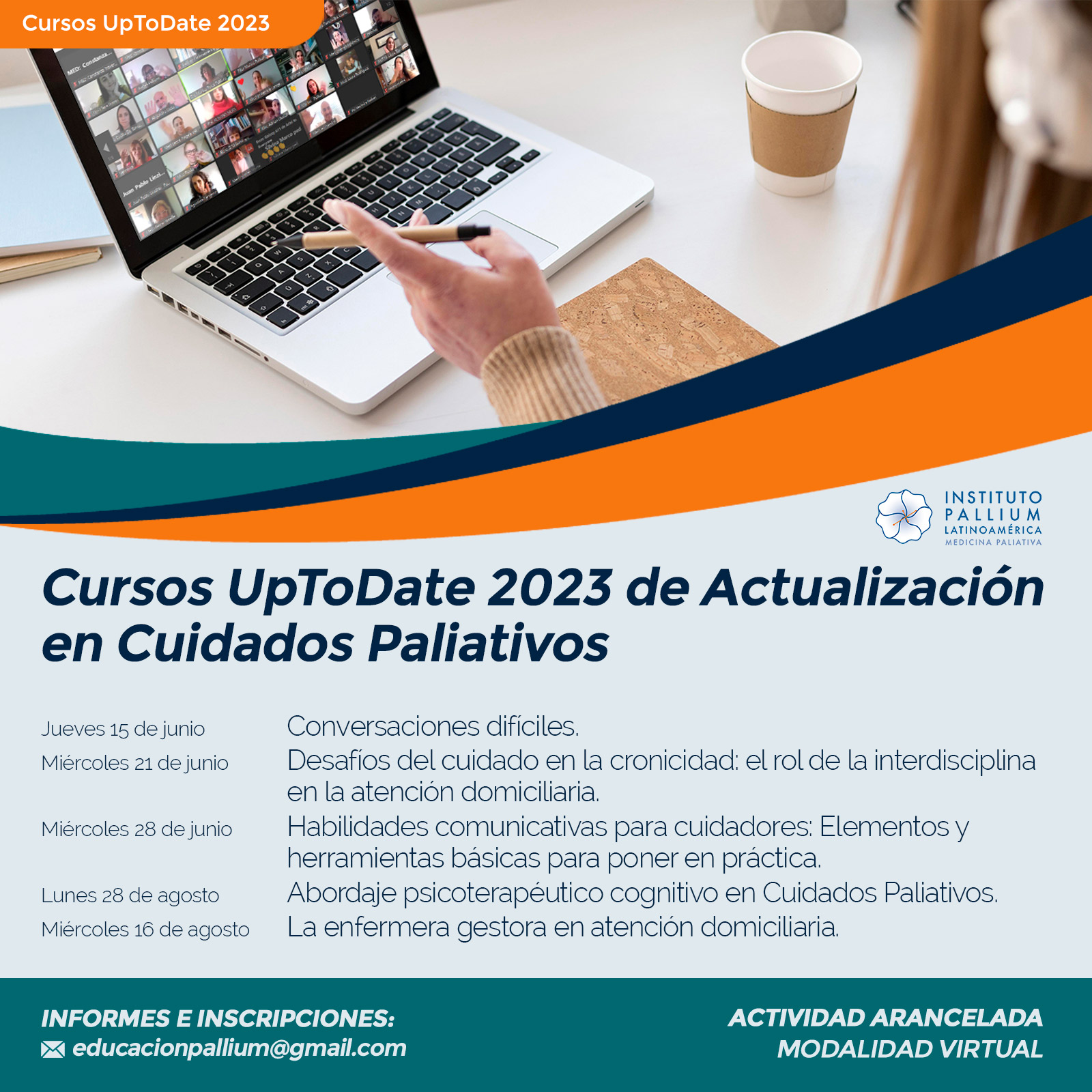 Instituto Pallium presenta el tercer ciclo de cursos cortos de actualización denominado “CICLO DE CURSOS UPTODATE 2023 EN CUIDADOS PALIATIVOS“. Serán 5 cursos distintos a lo largo del año, con distintas temáticas y duración. La modalidad será virtual, vía Zoom, y todos los cursos serán arancelados.